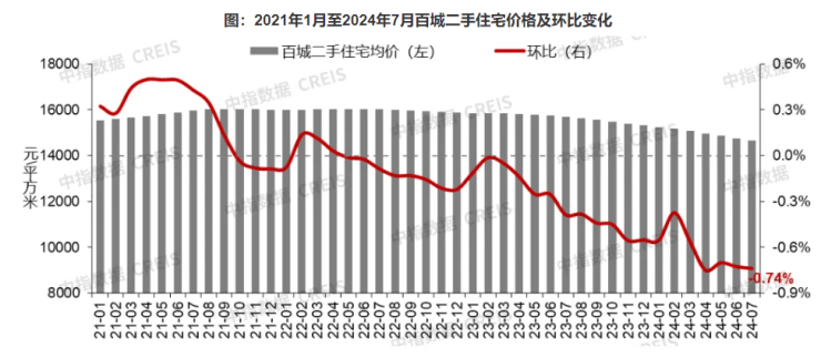 中国房地产指数系统百城价格指数显示,7月全国100个城市新建住宅平均价格为16443元/平方米,环比上涨0.13%,涨幅较6月收窄0.02个百分点。二手住宅方面,以价换量趋势延续,百城二手住宅价格连续27个月下跌至均价14653元/平方米。