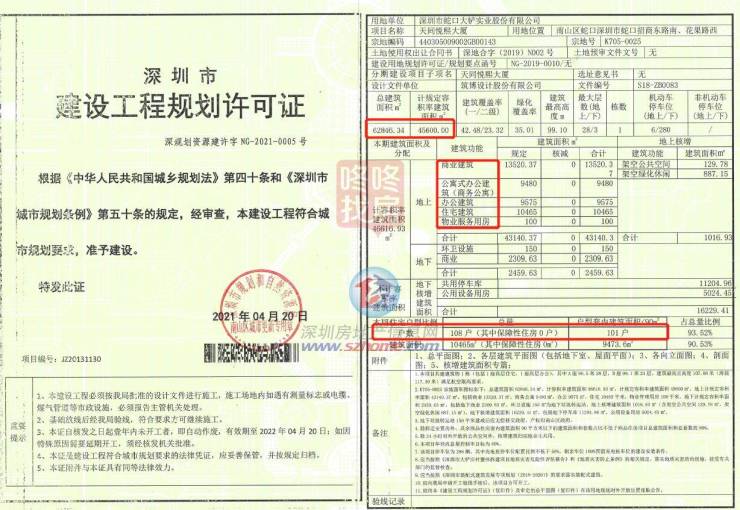 据公布的规划许可证上显示 ,项目总建面62846.34㎡,总户数108户(其中90平以下的101户),包含住宅、办公、商务公寓、商业;