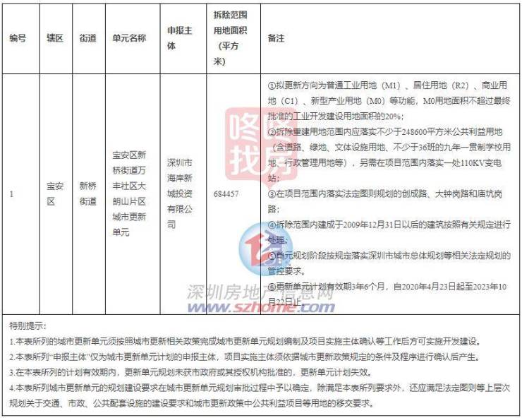 宝安区新桥街道万丰社区大朗山片区城市更新单元申报主体为深圳市海岸新城投资有限公司,备注: