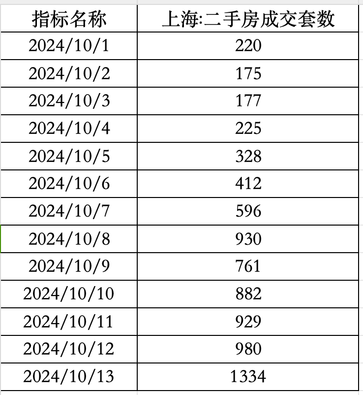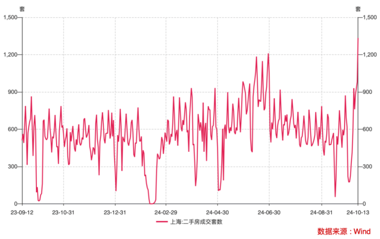 上海市房屋管理局、Wind数据显示,10月13日当天,上海二手房成交套数为1334套,环比上月同期增长147%,同比去年同期增长108%,创下了去年9月以来的新高。