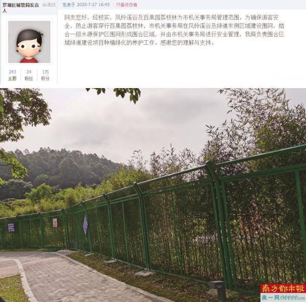 罗湖区城市管理和综合执法局(以下简称“罗湖区城管局”)曾回应称,风铃溪谷及百果园荔枝林为市机关事务局管理范围。为确保游客安全,防止游客穿行百果园荔枝林,市机关事务局在风铃溪谷及绿道东侧区域建设围网。