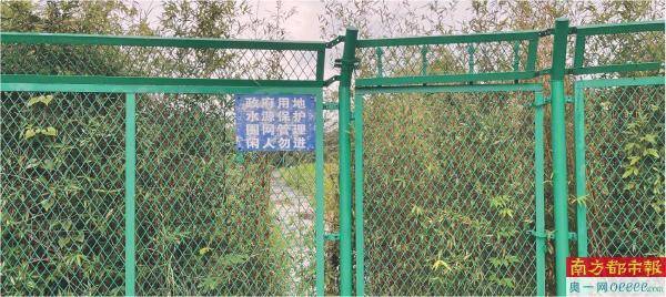 根据网友指引,奥一新闻记者日前走访现场,发现市民报料中提及的位置的确被绿色铁网围挡起来,一旁挂有蓝底白字的告示牌,上面写着“政府用地 水源保护 围网管理 闲人勿进”。围挡区域已经长出许多绿植,将原先的景观遮挡。