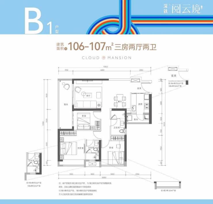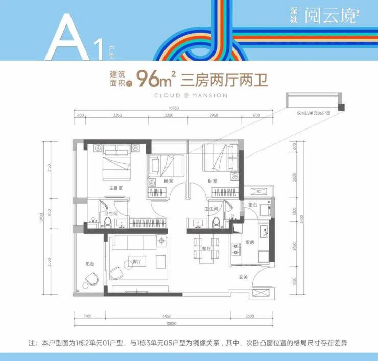 建面约96/106㎡三房两卫户型,匹配温馨三口之家对舒适生活的追求,双阳台或阔景阳台设计,让空间的利用更多元。