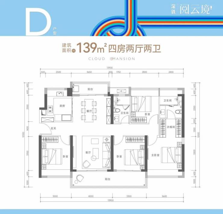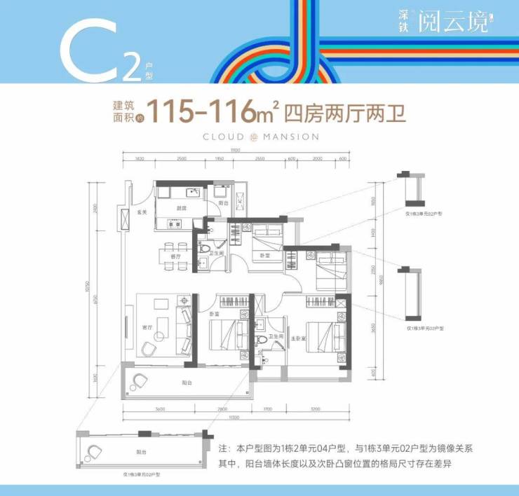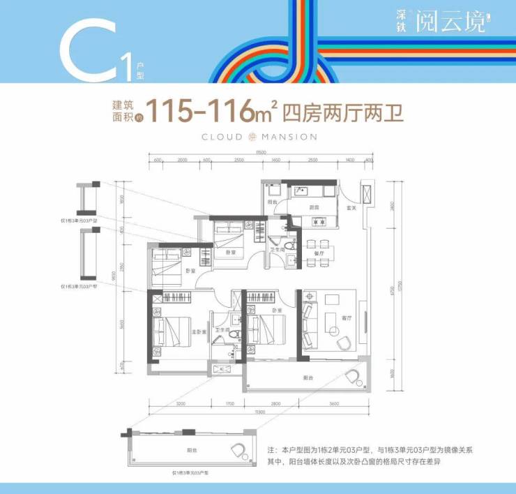 对于家庭成员较多或追求更为宽绰生活空间的家庭,阅云境还有丰富的四房选择,包括建面约115-116㎡及139㎡的面积段,双阔景阳台彰显空间尺度,通透布局将舒居生活氛围感拉满。