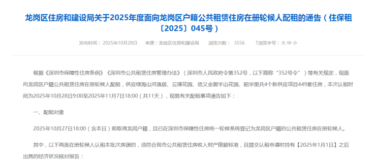 2025年10月27日18:00(含本日)前取得龙岗户籍,且已在深圳市保障性住房统一轮候系统登记为龙岗区户籍的公共租赁住房在册轮候人。