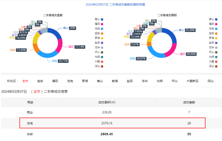 2024年2月7日二手房住宅网签28套。宝安1套;福田6套;龙岗8套;罗湖4套;南山6套;盐田1套;龙华2套;光明0套;坪山0套;大鹏0套。