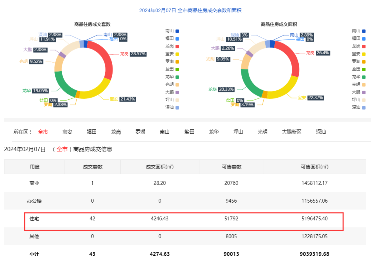 2024年2月7日新房住宅共网签42套。宝安9套;福田0套;龙岗12套;罗湖1套;南山1套;盐田0套;龙华8套;坪山5套;光明4套;大鹏1套;深汕1套。