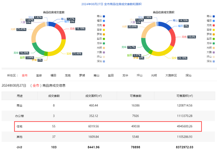 2024年8月27日新房住宅共网签55套。宝安14套;福田0套;龙岗10套;罗湖0套;南山4套;盐田2套;龙华9套;坪山1套;光明14套;大鹏0套;深汕1套。