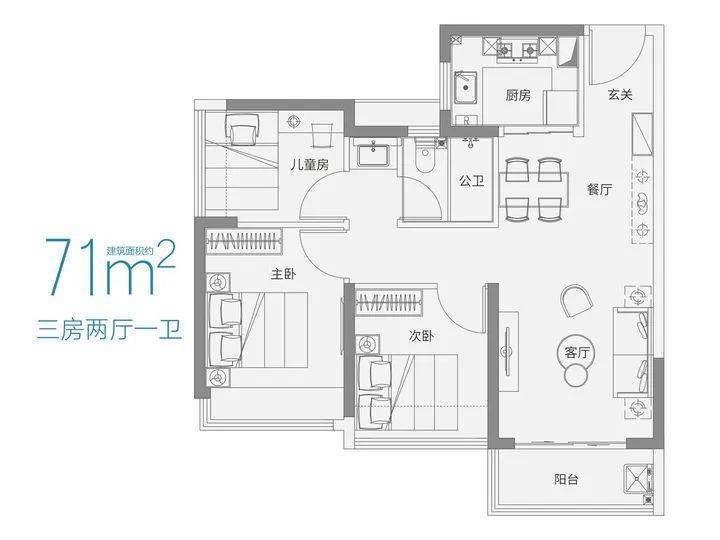 由5栋塔楼组成,小区有两种户型,建面约71㎡、81㎡三房,适合刚需购房者上车。
