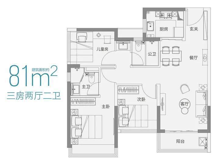 户型使用率78%,算正常水平,每个房间如果把飘窗利用起来,可以保障宽敞度,居住没有拥挤感。但片区80+㎡三房房源不少,考虑五年后二手流通,与周边仁恒高赠送、金地名峰复式相比之下,并没有优势。