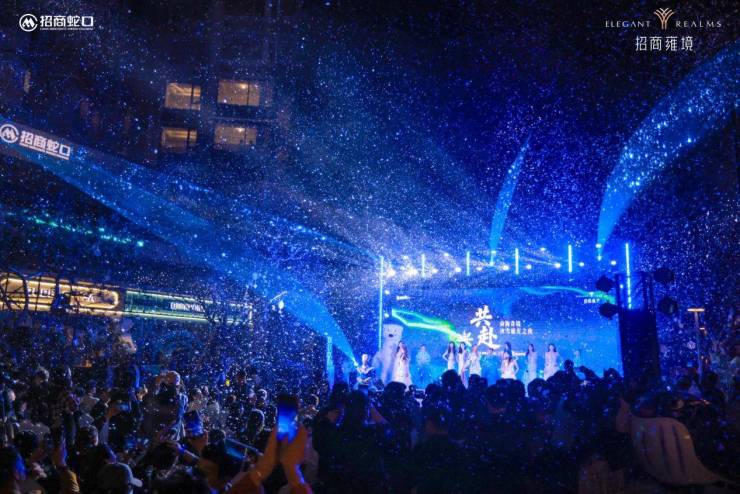 盛典尾声,伴随着冰雪女王的高歌和冰雪精灵的舞蹈,现场氛围达到顶峰。晶莹雪花悄然飘落,轻覆肩头;梦幻极光流转天幕,映照众人笑颜。千人仰首共鉴这一璀璨时刻,城市目光落位前海会展之心。