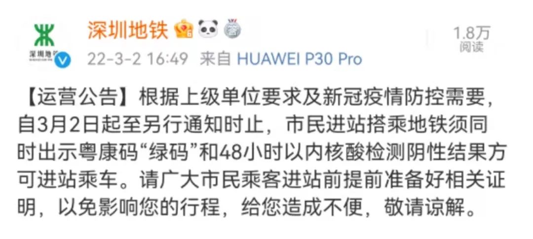 今天,深圳地铁发布运营公告,自3月2日起至另行通知时止,市民进站搭乘地铁须同时出示粤康码“绿码”和48小时以内核酸检测阴性结果方可进站乘车。