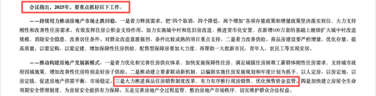 在未来工作方面,住建部会议延续了中央经济工作会议“着力稳定房地产市场”的表述,并指出多个重点: