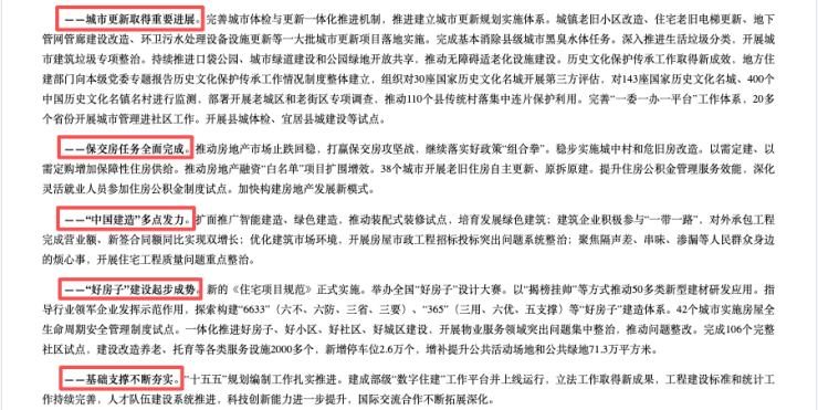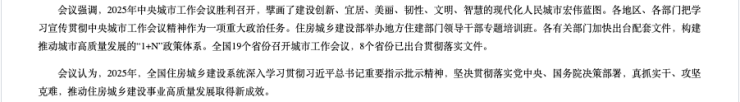 住建部会议强调:以“绣花”功夫精细化推进城镇老旧小区改造;高质量实施“两重”、“两新”项目建设;高效能推进城市治理;高标准建设文明城市,完善历史文化保护传承体系;高水平推动城乡融合发展,建设宜居县城等。