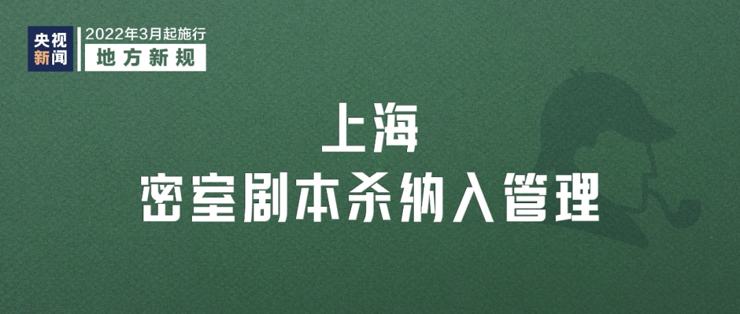 《上海市密室剧本杀内容管理暂行规定》3月1日起施行。明确经营单位应当自剧本上架之日起30日内,将自审后的剧本向所在区文化和旅游局备案登记。