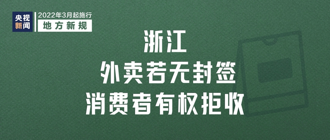 《浙江省电子商务条例》3月1日起施行。其中规定,外卖商家应当使用封签对配送的食品予以封口。未按规定使用封签对配送的食品予以封口或者封签损坏的,网约配送员有权拒绝配送,消费者有权拒绝签收。