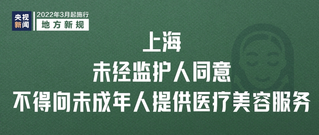 新修订的《上海市未成年人保护条例》3月1日起施行。规定未经未成年人父母或者其他监护人同意,不得向未成年人提供医疗美容服务;网络游戏服务提供者应当规范向未成年人提供付费服务,限制未成年人使用与其民事行为能力不符的付费服务。