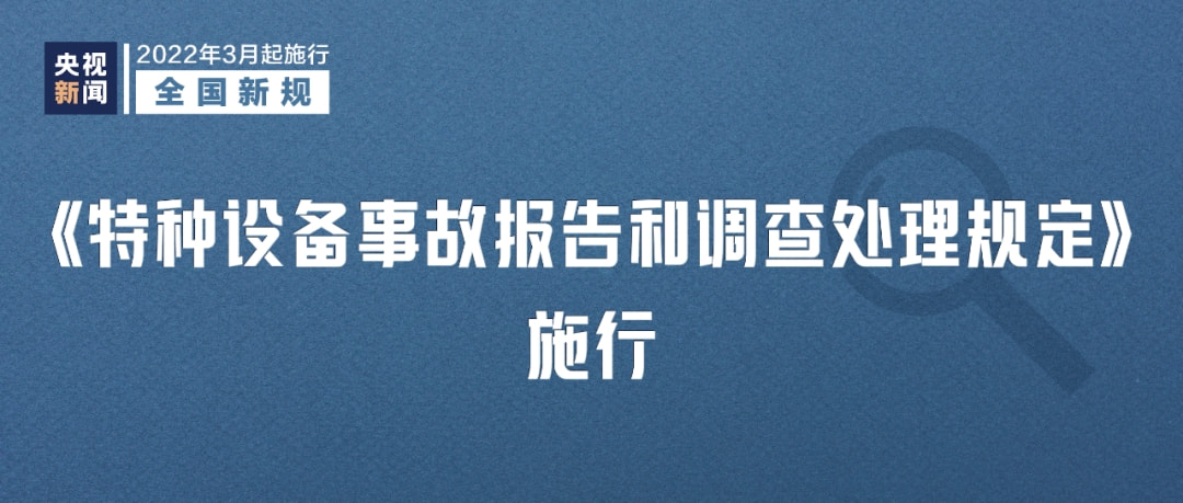 《特种设备事故报告和调查处理规定》3月1日起施行。特种设备发生事故后,事故现场有关人员应当立即向事故发生单位负责人报告;事故发生单位的负责人接到报告后,应当于1小时内向事故发生地的县级以上市场监督管理部门和有关部门报告。