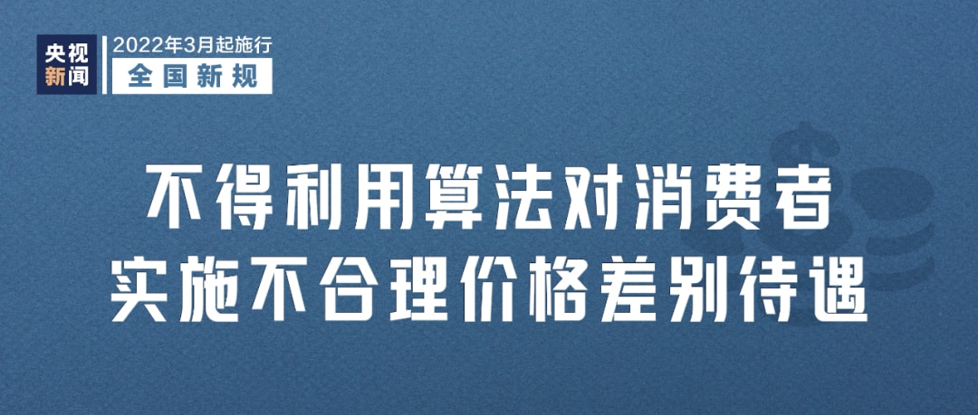 《互联网信息服务算法推荐管理规定》3月1日起施行。明确不得根据消费者的偏好、交易习惯等特征利用算法在交易价格等交易条件上实施不合理的差别待遇。
