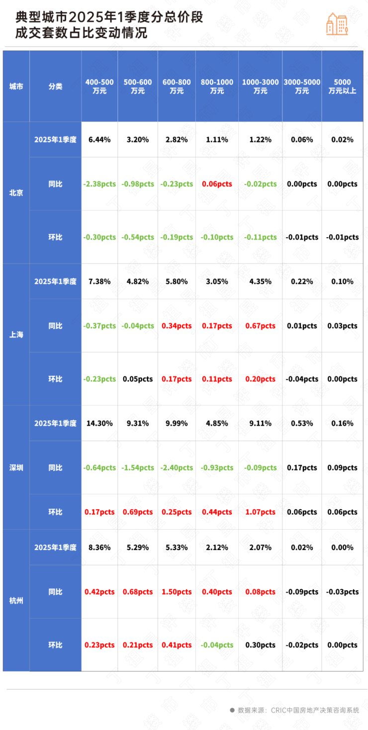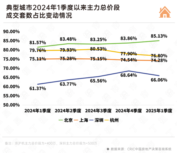 从成交情况来看,2025年1季度以来,除了北京主力总价段400万以内成交集中度保持上升之外,其余三城主力总价段集中度均有了不同程度回落。