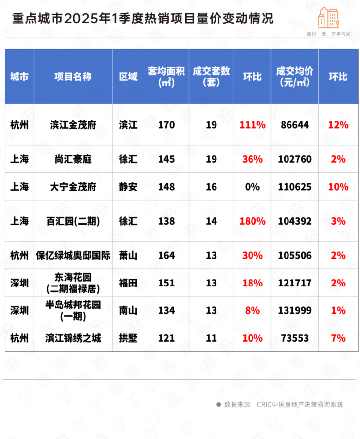 以上海徐汇区尚汇豪庭为例,2025年1季度该小区成交套数达到19套,成交量较2024年四季度增幅也达36%,整体成交均价较2024年四季度环比上涨2%。另外,杭州的滨江金茂府也是如此,2025年1季度成交套数为19套,环比增长111%,成交均价环比上涨12%。