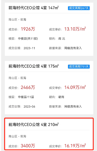 根据@行舟深房查 二手房成交数据显示,深铁前海时代尊府隔壁的深铁时代CEO公馆11月最新成交房源均价约13-14万/㎡,超200㎡以上的大面积成交高达16万/㎡。对比之下,深铁前海时代尊府与之存在超500万的价差!