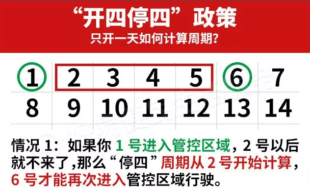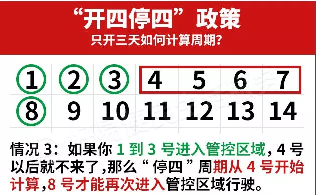 比如说,1号到4号连续4天你都开车去了广州管控区域,那么5号到8号你不能再开车踏入,否则就要罚款扣分了。