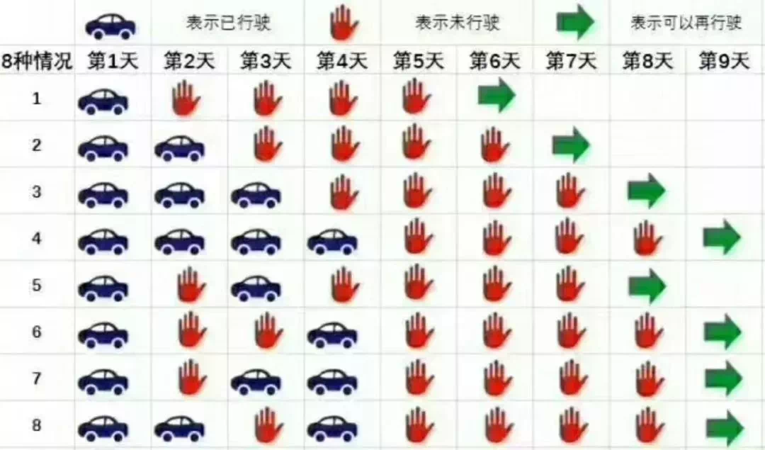 外地牌去广州“连续行驶时间最长不得超过4天,再次驶入须间隔4天以上”。如下图所示,一共四种情况。表格中,绿色表示可以行驶的天数,红色表示不能行驶的天数。