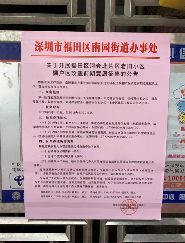 此外,福田区南园街道近期也贴出了河套北片区老旧小区棚户区改造前期意愿征集的公告,龙阁住宅楼等8个小区集中启动更新改造意愿征集工作。