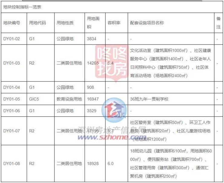 DY01-02用地性质公园绿地,用地面积3834平方米;DY01-03用地性质为二类居住用地,用地面积14265平方米,容积率5.4,配套设施项目文化活动室(建筑面积1000㎡)、社区健康服务中心(建筑面积1400㎡)、社区老年人日间照料中心(建筑面积750㎡)、社区体育活动场地(场地面积2400㎡)。