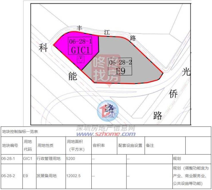 还有[光明高新技术产业园区]法定图则(局部修编)06-28地块规划调整,调整后,06-28-1用地性质行政管理用地,用地面积5200平方米;06-28-2用地性质发展备用地,用地面积12002.5平方米。