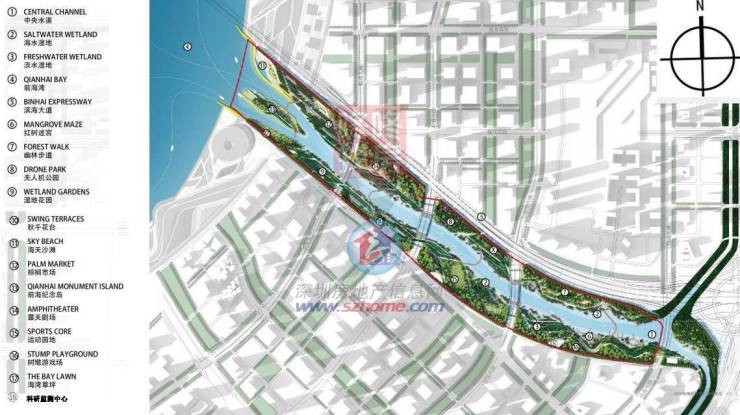前海桂湾湿地公园(暂定名)为前海桂湾 及前湾片区之间,全长1.9公里,总规划面积为675亩,即45 公顷。