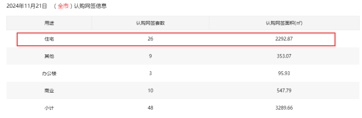 2024年11月21日新房住宅认购网签26套。其中,宝安20套;福田4套;龙岗0套;罗湖0套;南山2套;盐田2套;龙华2套;坪山0套;光明0套;大鹏0套;深汕0套。