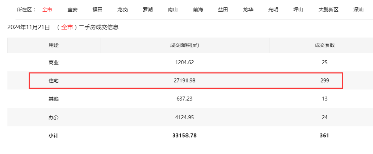 2024年11月21日二手房住宅网签299套。其中,宝安40套;福田46套;龙岗93套;罗湖31套;南山48套;盐田5套;龙华27套;坪山4套;光明3套;大鹏2套。