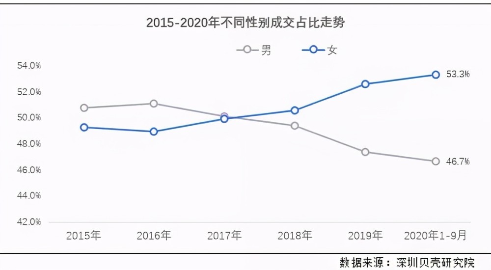 据深圳贝壳研究院调查显示,2017年左右,深圳女性购房比例就已经超过男性,2020年,女性购房更是多达53.3%,远远超过男性的置业率。