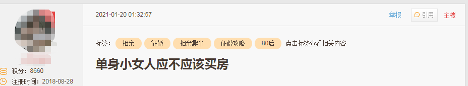 以【家在】帖子中单身女性是否应该置业的询问帖为例,可以看到,【家在】网友超过一半的评论是支持深圳单身女性置业的,认为应该买!