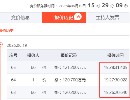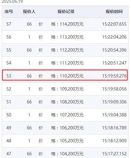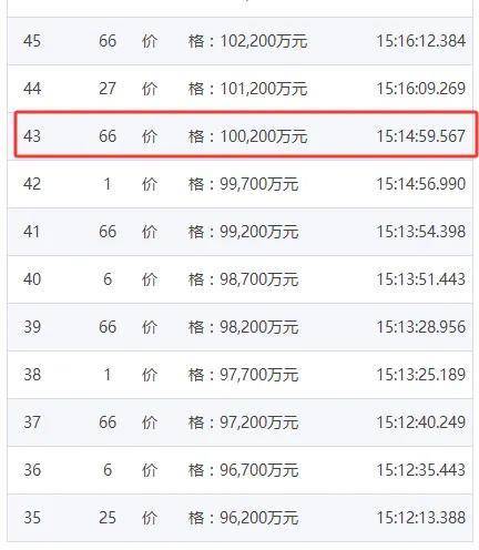 终于,在第43轮,由66号报价,地块竞拍价突破10亿元!紧接着,主持人调整竞价阶梯为1000万元。