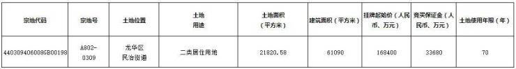 位于龙华民治的A802-0309宗地,拟于7月7日15时出让,挂牌起始价16.84亿元。