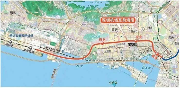机前段线路贯穿宝安区,起自穗深城际深圳机场站,终至前海站,全线地下敷设总长15.2公里,共设西乡、宝安、前海3座车站。项目设计时速达160km/h,将采用8辆编组的CRH6型动车组列车。