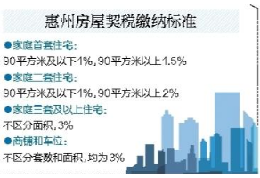“也就是说,自2016年2月22日起,普通住房标准不再作为房地产交易环节契税优惠政策的依据,居民家庭在我市购买首套或第二套住房缴交的契税,享受的优惠政策均按该规定执行,第三套及以上住房按3%的税率缴纳契税。”市税务局相关负责人表示,政策实施后,市民购买或销售住房是否享受优惠政策与该住房是否属于普通住房不再相关,而是与面积和家庭住房套数挂钩,现在惠州的政策执行口径和2016年2月22日开始执行的政策一致。