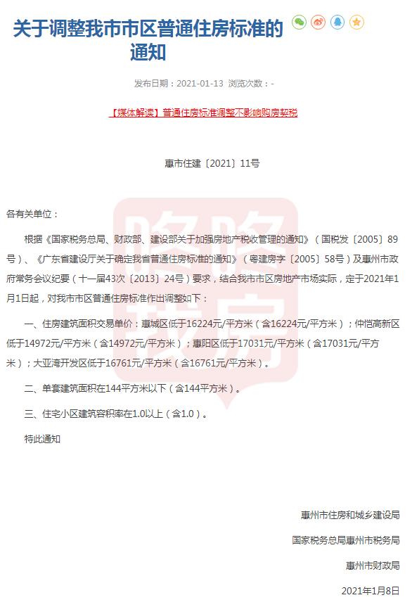1月13日,惠州市住房和城乡建设局、国家税务总局惠州市税务局、惠州市财政局发布通知,调整惠州普通住房标准。