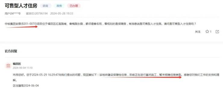 此前,有市民在领导留言板咨询中核B201-0070项目是否为可售型人才房,官方的答复则是:暂未明确住房类型。