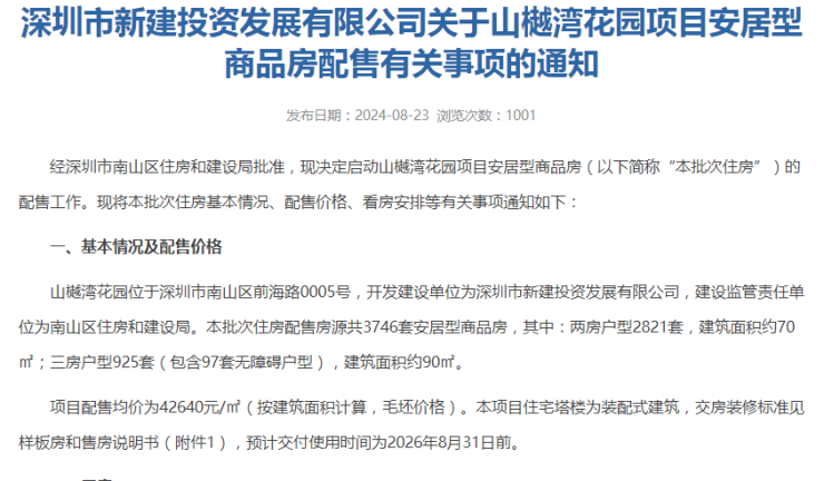 8月23日,南山住建局发布山樾湾安居商品房配售公告,本次共配售3746套安居型商品房。其中,两房户型2821套,建筑面积约70㎡;三房户型925套(包含97套无障碍户型),建筑面积约90㎡,配售均价为42640元/㎡,预计交付使用时间为2026年8月31日前。