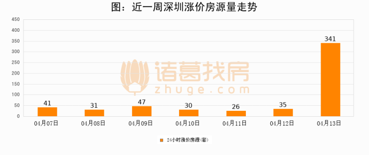 根据诸葛找房数据显示,深圳24小时涨价房源量为341套,较04月12日增加306套,环比上涨874.3%。与此同时,涨价房源占比小幅扩大,业主信心有所提升。