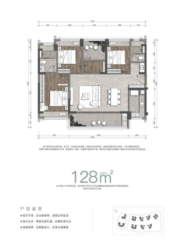 128㎡4房为横厅设计,餐客厅一体且连接开间为6.8米的大景观阳台,空间感阔绰,观景休闲十分惬意;主卧进深达4.5米,收纳空间足,整体空间非常开阔。