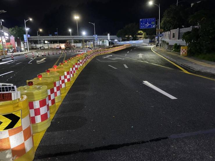 在交通疏解中,有关参建单位筹划交通导改前期准备工作,安装爆闪灯、设置防撞桶,张贴导向反光标识、布置路标牌等,将交通疏解方案要求逐一核实核查,确保交通疏解顺利实施,安全可靠。