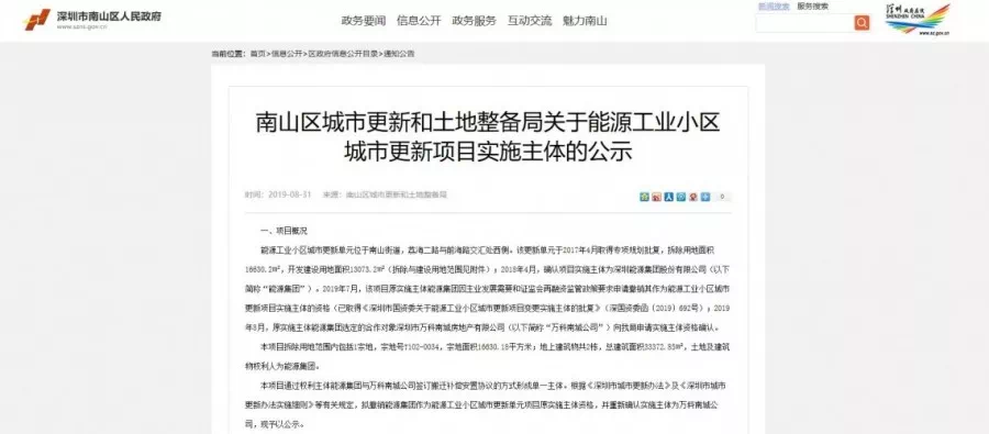 近日,南山区城市更新和土地整备局,发布关于能源工业小区更新项目的实施主体公示: