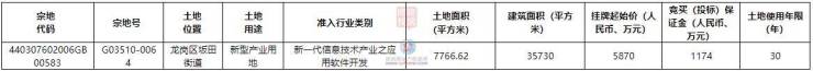 宗地号G03510-0064,土地位置龙岗区坂田街道,土地用途新型产业用地,准入行业类别新一代信息技术产业之应用软件开发,土地面积7766.62平方米,建筑面积35730平方米,挂牌起始价5870万元,土地使用年限30年。
