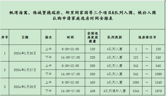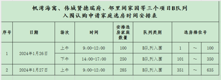 A队列(两房)入围及候补入围认购申请家庭的选房时间为2024年1月26日至2024年1月28日;