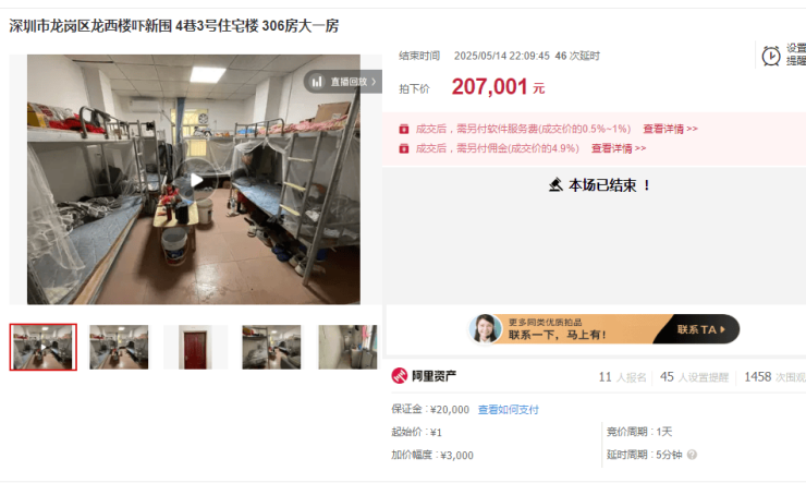 今年5月份,宝安松岗一套55㎡的三房两厅一卫房源,也挂出了1元起拍价,最后拍出了36万的总价。